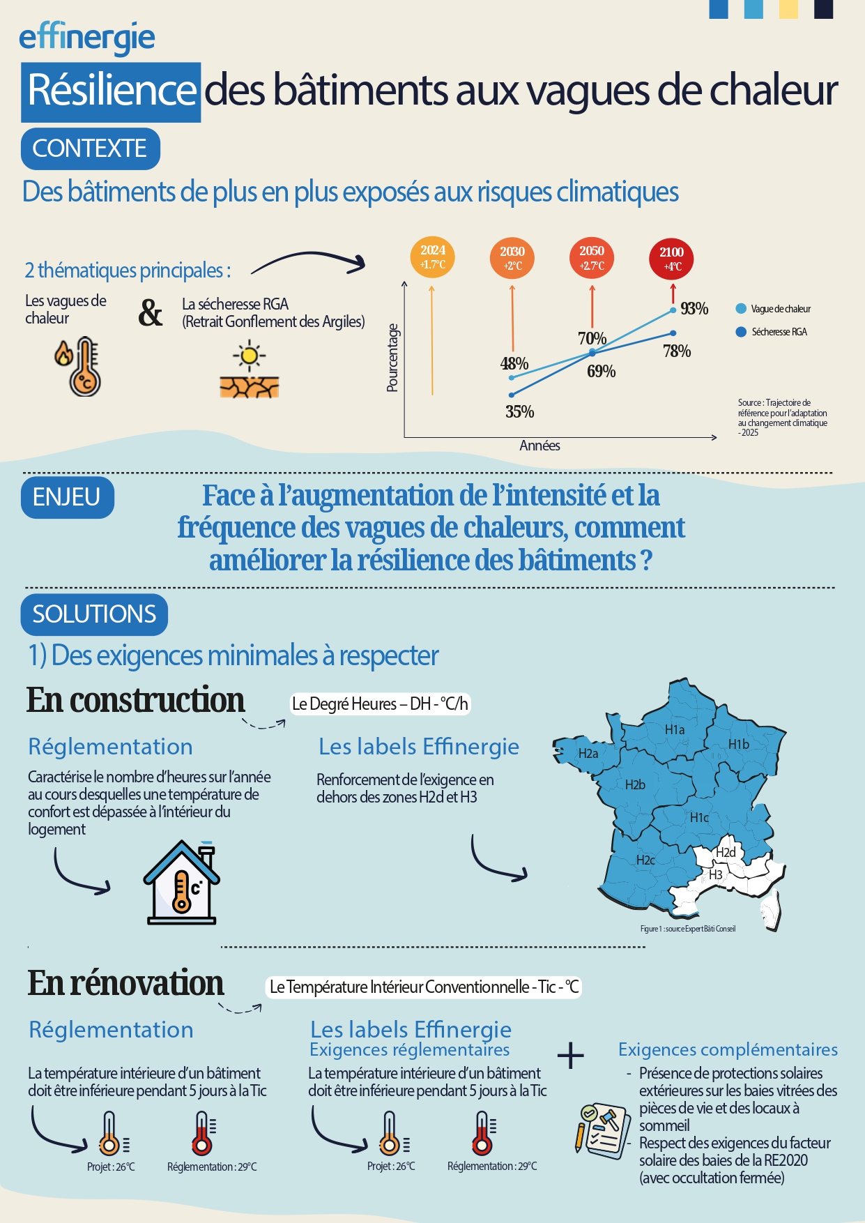 Le Collectif Effinergie a élaboré une infographie qui met en lumière les enjeux du changement climatique pour le secteur du bâtiment et les leviers d’action permettant d’améliorer la résilience des constructions, tant en neuf qu’en rénovation, face aux vagues de chaleur. Cette infographie, synthétique et pédagogique, s’adresse à tous les acteurs qui souhaitent mieux comprendre et anticiper les défis climatiques.